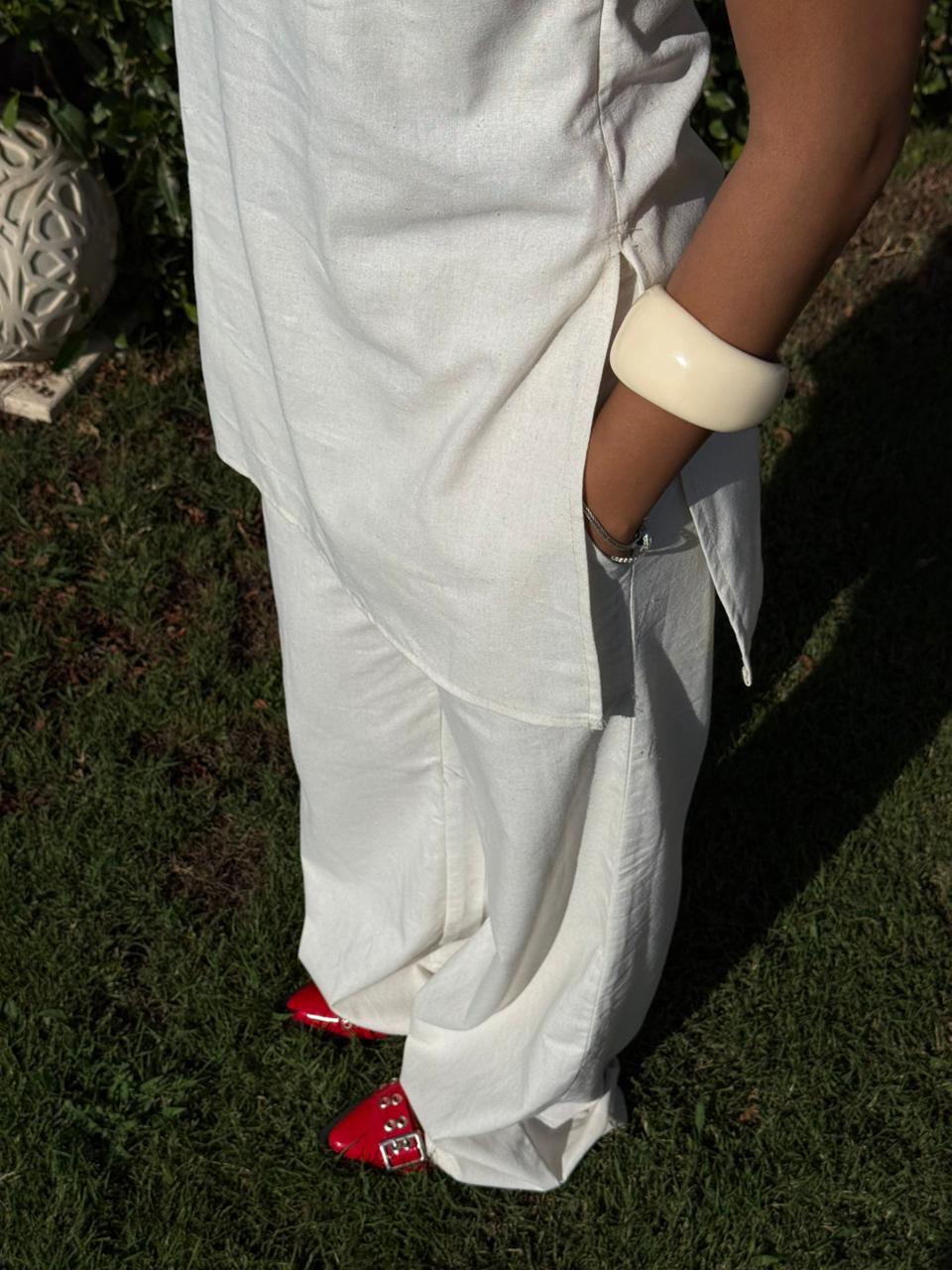 This white linen set blends effortless elegance with everyday comfort, making it the ultimate go-to for warm-weather dressing. Crafted from breathable, lightweight linen, the set features a loose, flowing fit that flatters all body types while allowing for ease and movement. This wil be your favourite all-ocassions go to, perfect for summer days or balmy evenings.